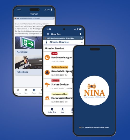 Mit der Notfall-Informations- und Nachrichten-App des Bundes, kurz Warn-App NINA, erhalten Sie wichtige Warnmeldungen des Bevölkerungsschutzes für unterschiedliche Gefahrenlagen, wie zum Beispiel Gefahrstoffausbreitung oder einen Großbrand. Seit Juli 2025 erhalten Sie in einem neuen Warnbereich Warnmeldungen der Polizei für besondere polizeiliche Lagen, wie beispielsweise die Androhung von Gewalttaten, wie Bombendrohung oder die Warnung vor gefährlichen Straftätern, nach denen öffentlich gefahndet wird. Wetterwarnungen des Deutschen Wetterdienstes und Hochwasserinformationen der zuständigen Stellen der Bundesländer sind ebenfalls in die Warn-App integriert.